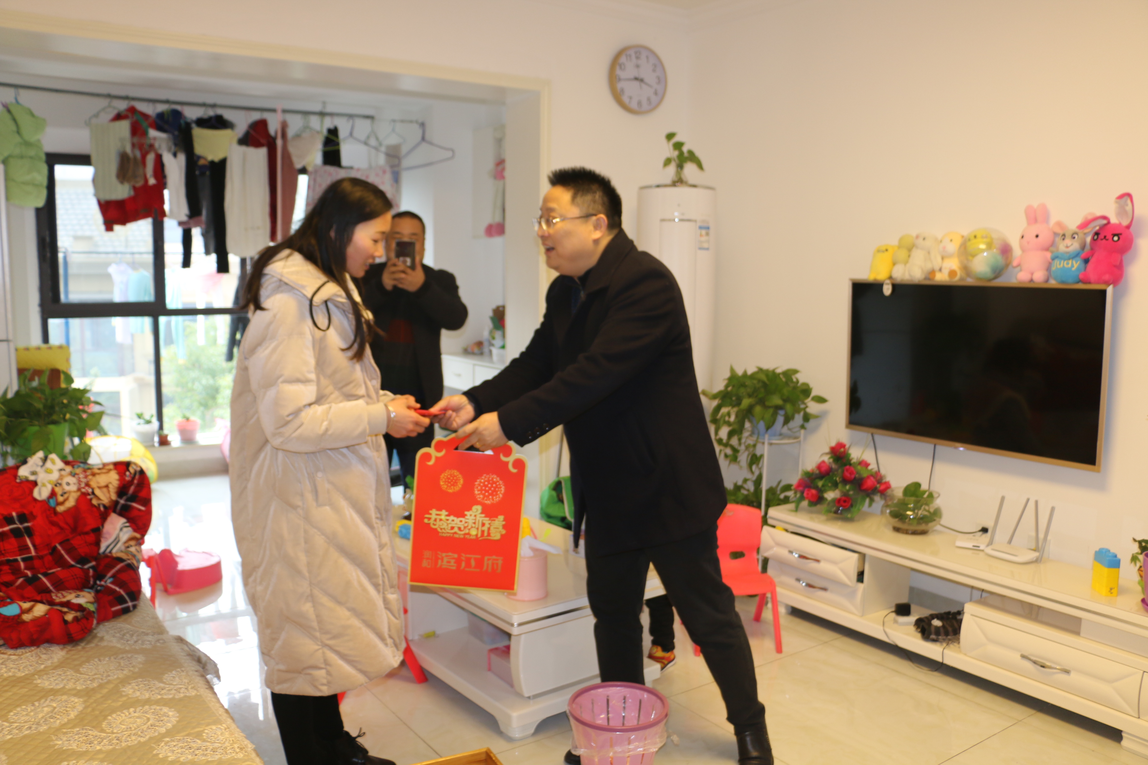 2019年1月30日,春节前夕,pg电子娱乐城实业副总裁易云龙代表公司董事长肖玉军和总裁办成员,带领集团客户服务部向pg电子娱乐紫郡小区多户困难业主,表达对公司对他们的关心和祝福,并送上年货物资和红包。